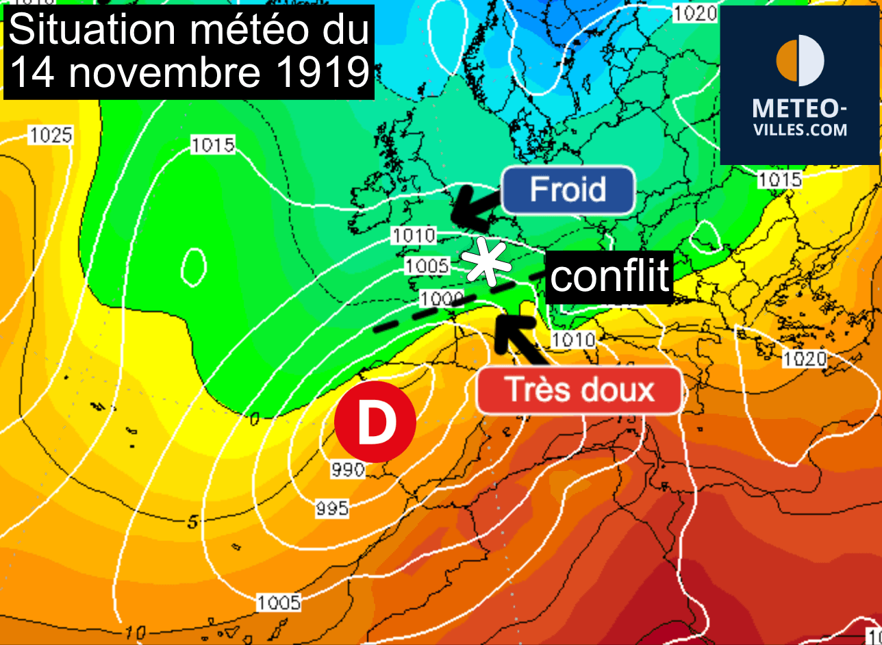Le 14 novembre 1919, un important conflit de masses d’air se manifeste sur la moitié Nord de la France, caractérisé par des températures très basses, tandis qu’une remontée d’air chaud affecte l’ensemble de la moitié Sud. Une tempête de neige d’une ampleur significative paralyse une large portion du bassin parisien jusqu’à la Franche-Comté.