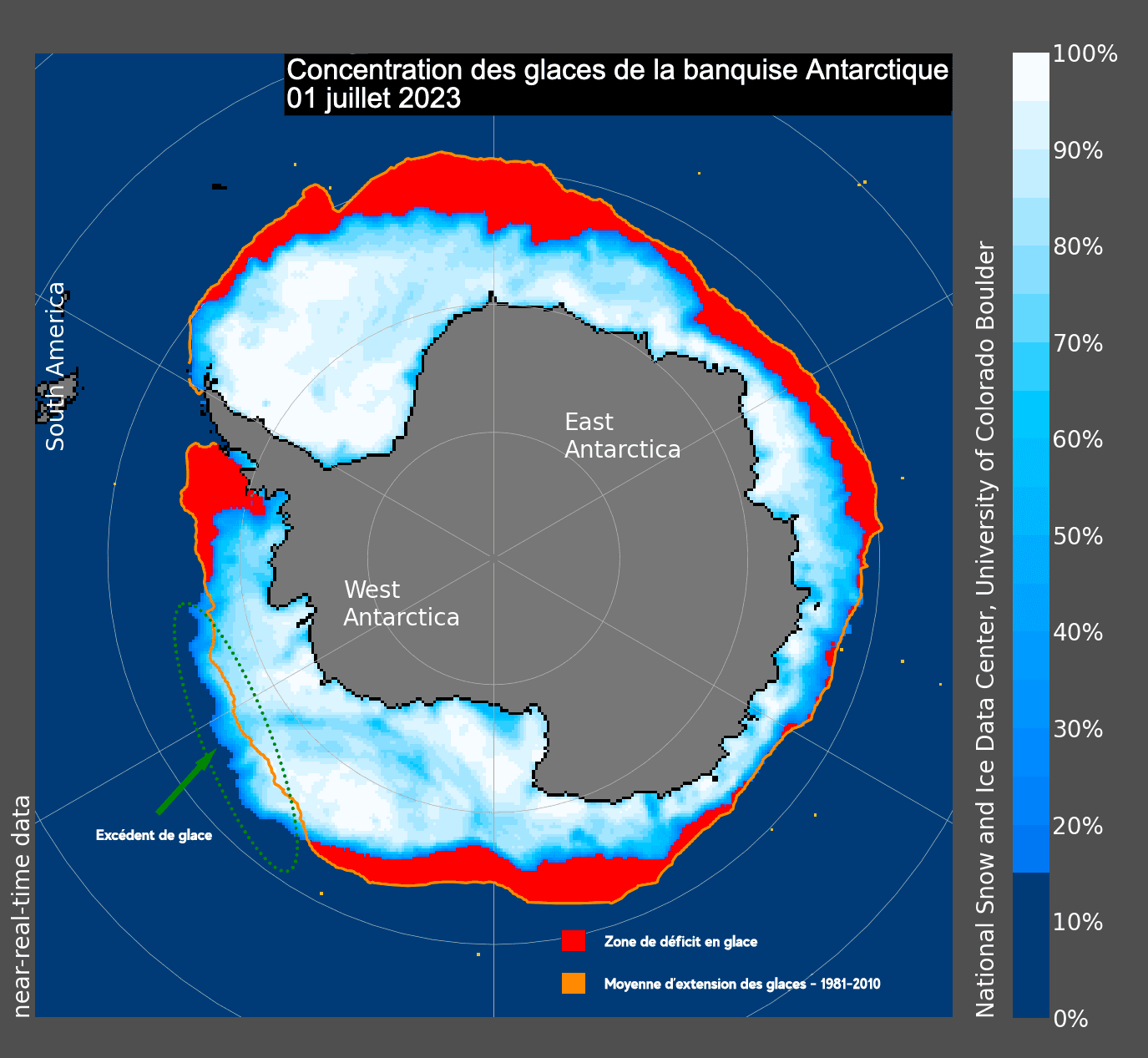 La quasi-totalité de la barrière de glace de l'Antarctique est concernée, et ceci de manière notable. Seule une portion sur l'Ouest de l'océan Austral (côté océan Pacifique) possède un léger excédent de glace en ce début de mois de juillet. Une situation qui n'est pas sans conséquences pour les années à venir : plus les glaces sont minces, plus elles se montrent vulnérables face à l'augmentation de la température mondiale. Une re-glaciation de ces zones perdues peut s'annoncer très compliquée dans cette tendance de fond au changement climatique, avec un point de non-retour de plus en plus proche...
