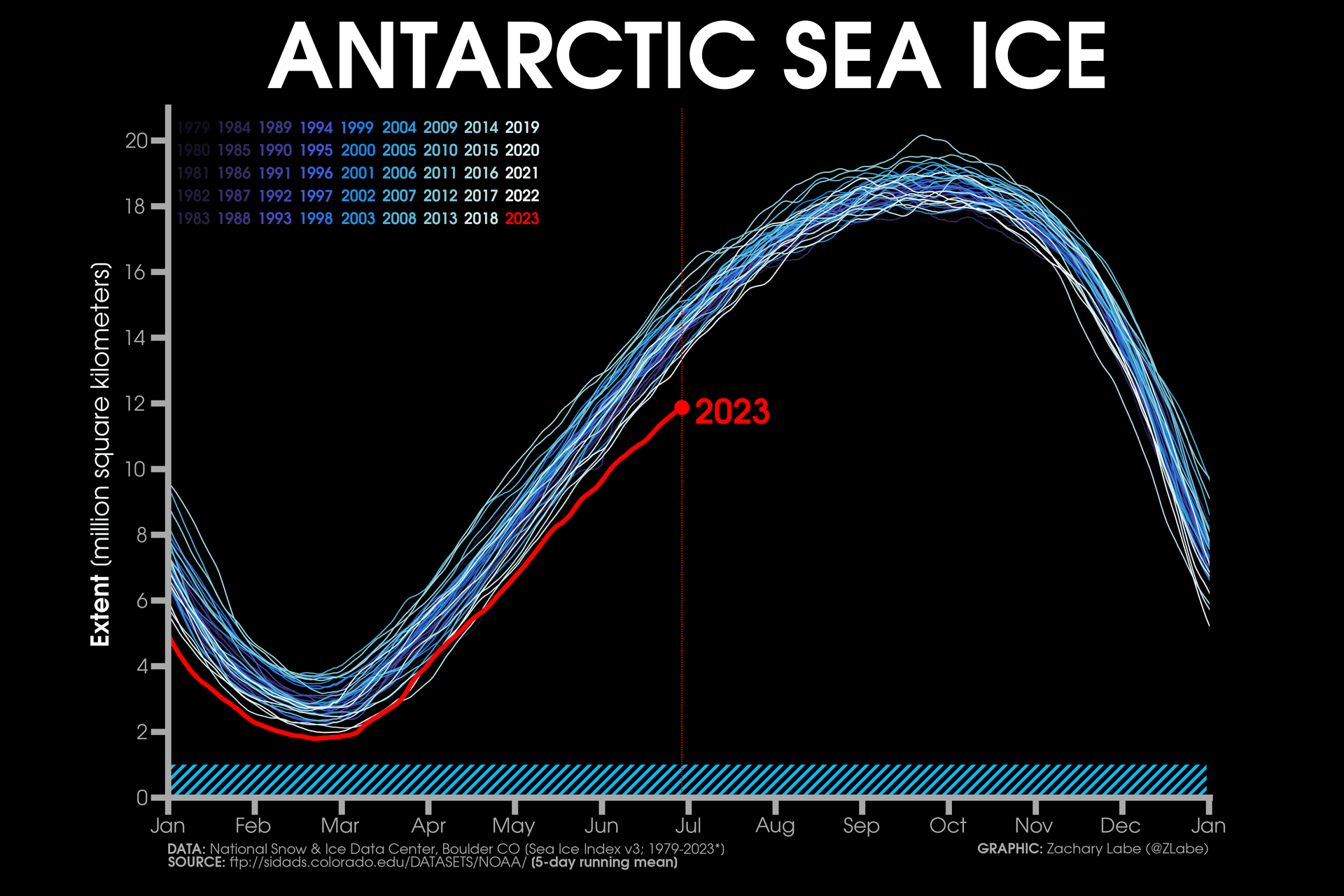 Étendue des glaces de la banquise en Antarctique au 30 juin 2023 (en millions de km2) - Zachary Labe