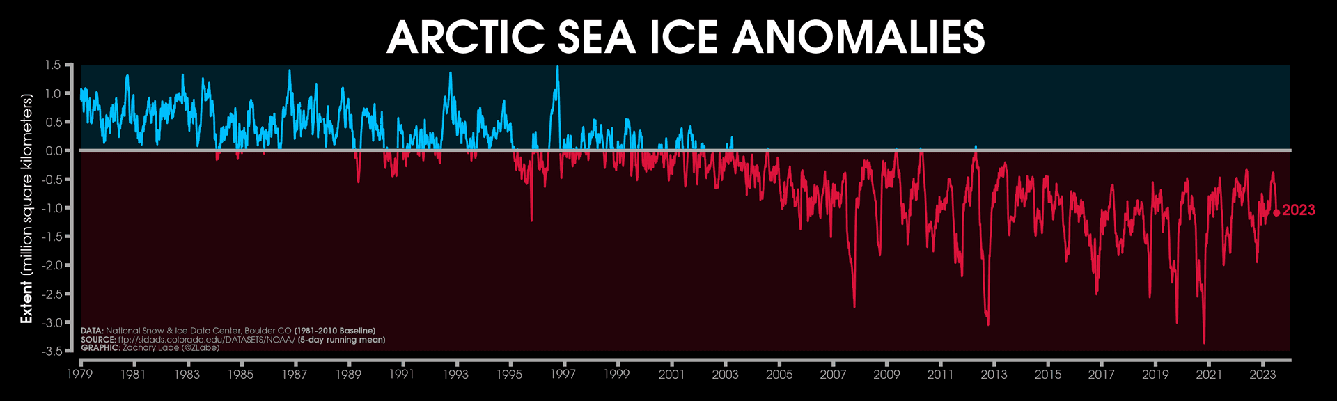 Anomalie de l'étendue des glaces de la banquise Arctique depuis 1979 (en millions de km2) - Zachary Labe