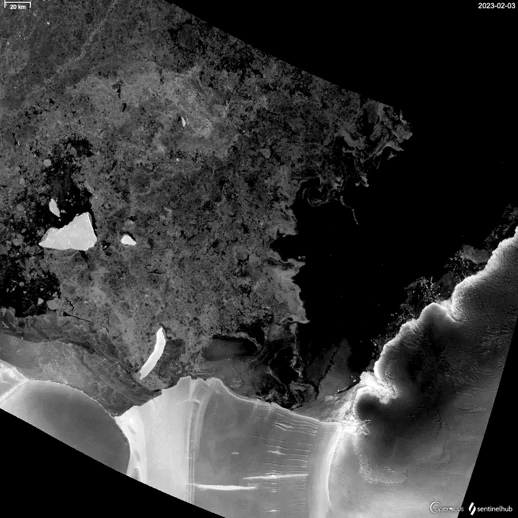 Dérive de l'iceberg A-81 le long de la barrière de glace de Brunt (Antarctique) - de début février à la mi-juin 2023 - Satellite Sentinel-1 / Copernicus