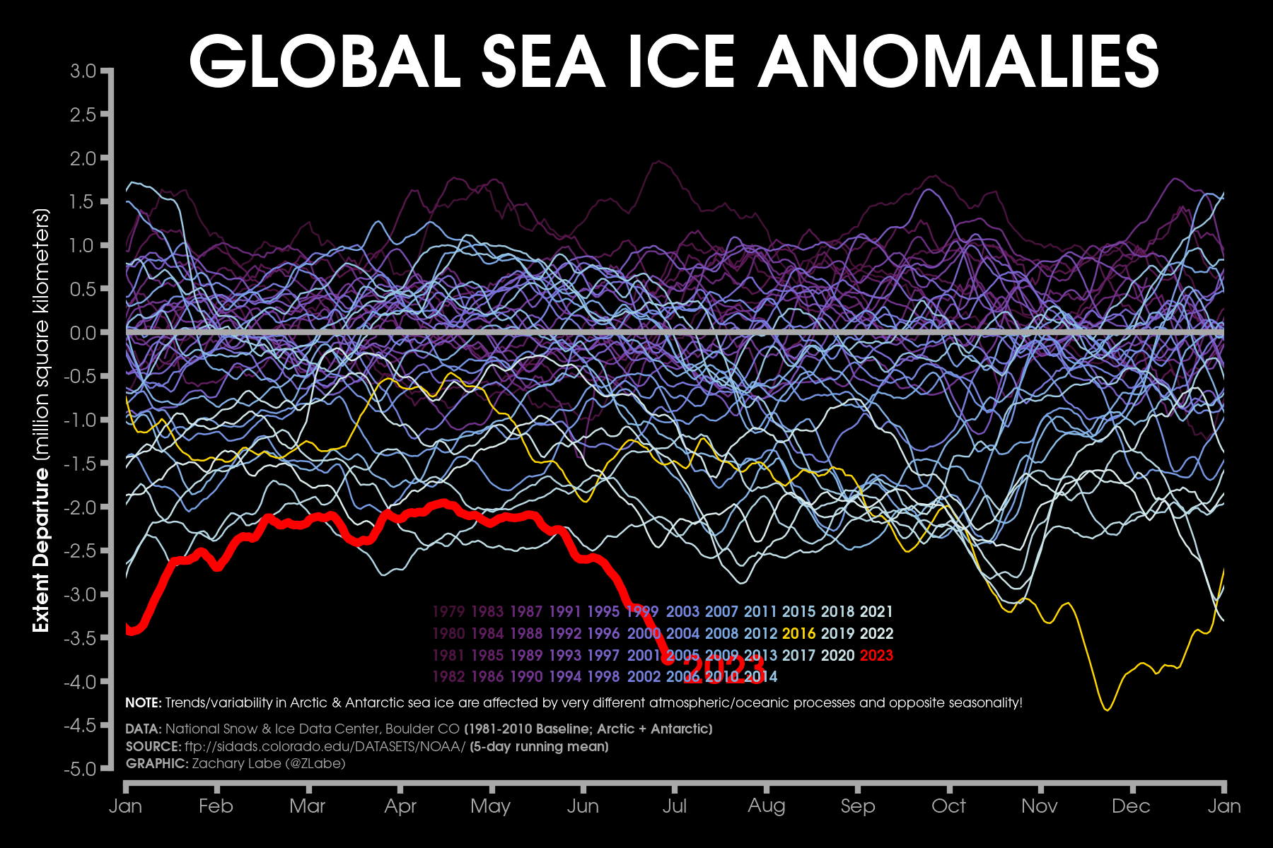Anomalie de l'étendue totale de la banquise mondiale (Arctique + Antarctique) au 30 juin 2023 (en millions de km2) - Zachary Labe