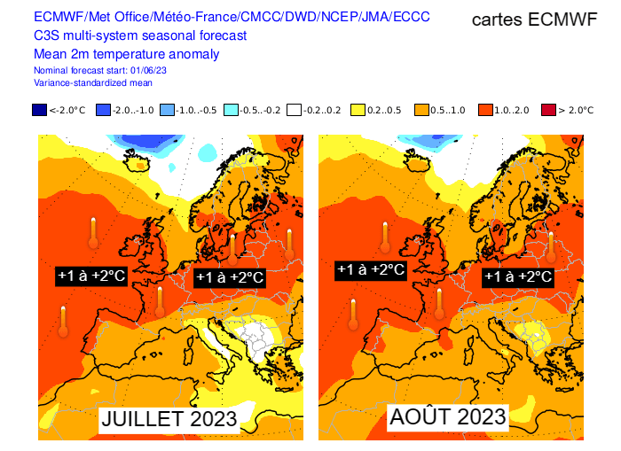 Moyenne des modèles saisonniers pour l'anomalie thermique en juillet et août 2023 - via ECMWF