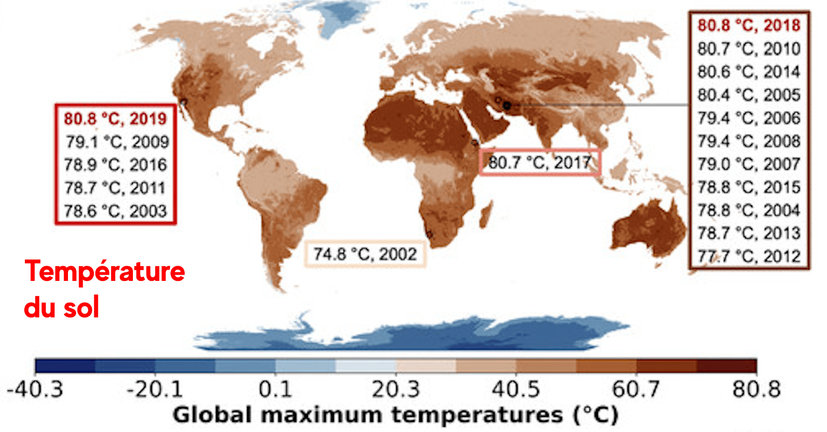 Au niveau de la température des sols, les valeurs sont toutes autres et bien plus extrêmes, avec des écarts souvent supérieurs à 20°C par rapports aux records mondiaux de température de l'air.