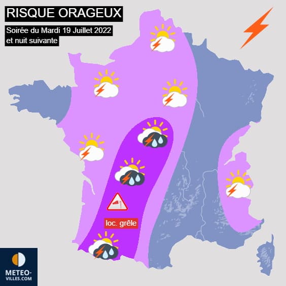 L'approche de l'air océanique rencontrant une masse d'air bouillante va déstabiliser la masse d'air dans le courant de la soirée de ce mardi 19 juillet 2022. Les orages vont s'initier à partir du piémont pyrénéen, remontant rapidement en direction du Limousin avant de terminer leur course sur les régions centrales dans le courant de la nuit de mardi à mercredi. Ils seront ponctuellement forts avec un risque de pluie intense, de grêle et de bourrasques de vent pouvant localement atteindre les 100 km/h. Notons que des orages plus isolés seront également possibles sur le nord du pays.