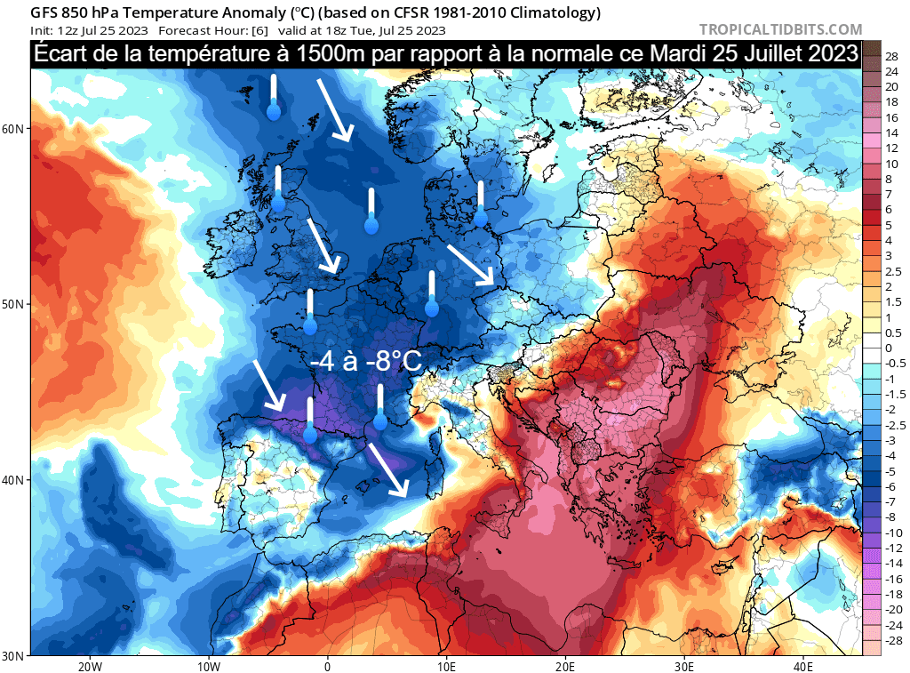 Ainsi, ce flux de nord-ouest nous amène un décrochage d'air frais venu tout droit de Mer de Norvège. Si la situation n'est pas exceptionnelle, elle est tout de même notable car les températures de la masse d'air vers 1500 mètres se situaient 4 à 8°C sous les moyennes de saison ce mardi 25 juillet 2023. Des coups de fraîcheur de cet ordre ont toujours fait partie des étés français mais il faut avouer qu'ils ont été rares ces dernières années et que nous nous sommes habitués aux fortes chaleurs, d'où un ressenti parfois pénible (notamment pour les vacanciers).