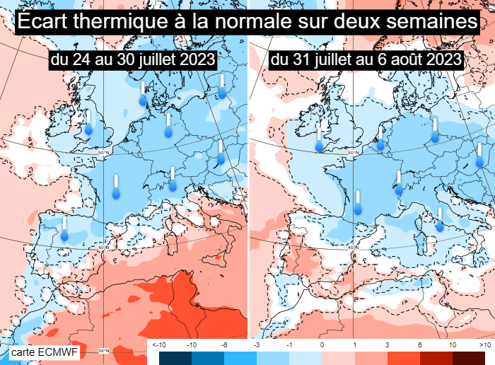 Prévisions des anomalies thermiques pour la fin juillet et le début août 2023 - cartes ECMWF