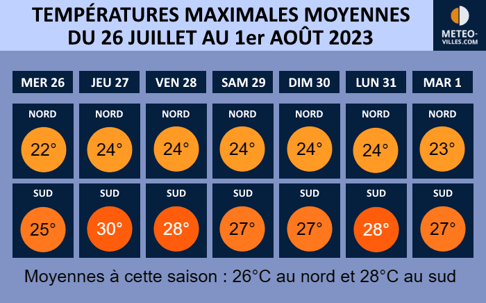 Températures moyennes prévues du mercredi 26 juillet au mardi 1er août 2023 - Météo Villes