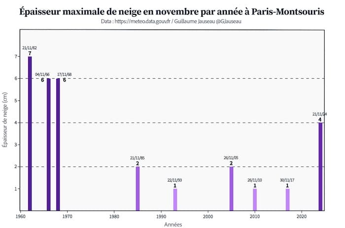 Épaisseurs de neige maximales en novembre à Montsouris depuis 1960 - Graphique : G. Jauseau