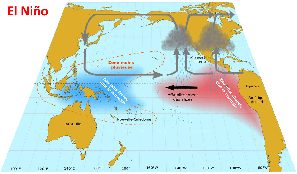 Dans le Pacifique, les alizés soufflent d'est en ouest du nord de l'Amérique du Sud en direction du sud de l'Asie. Ces derniers contribuent à faire remonter les eaux froides des profondeurs sur l'est du bassin pacifique tandis que les eaux asiatiques se réchauffent. Toutefois, ces alizés peuvent être perturbés. Lors d'une phase d'El Niño, les alizés faiblissent ce qui engendre un réchauffement anormal des eaux au large de l'Amérique du Sud et de l'Amérique Centrale. Dans le même temps, les eaux d'Asie du Sud se refroidissent. Cette modification de la température du Pacifique a des conséquences directes sur les températures et la pluviométrie de ces zones du globe.