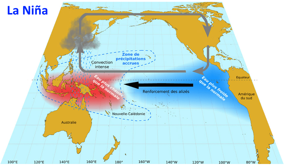 Schéma d'une situation de La Niña sur le Pacifique – via Météo France