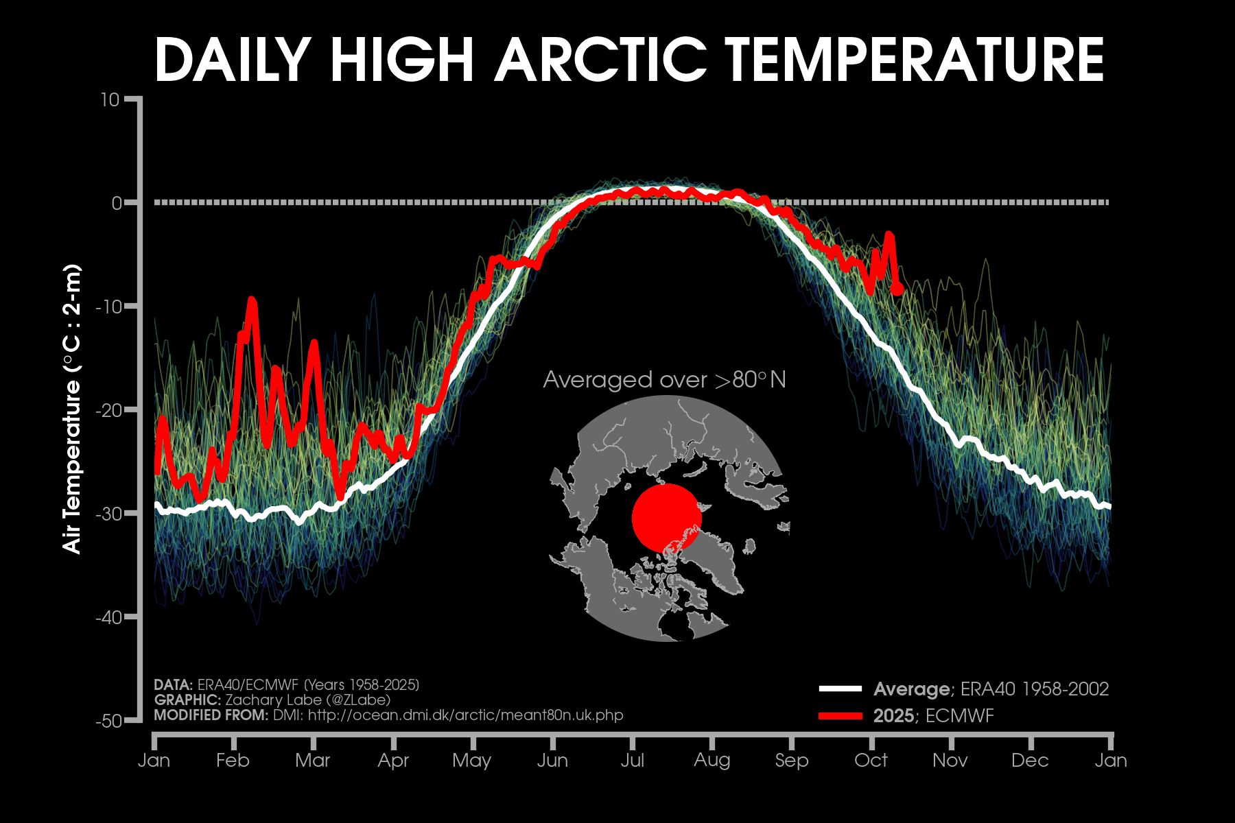 Température moyenne en Arctique (2025 en rouge) par rapport à la moyenne (en blanc) - via zacklabe.com