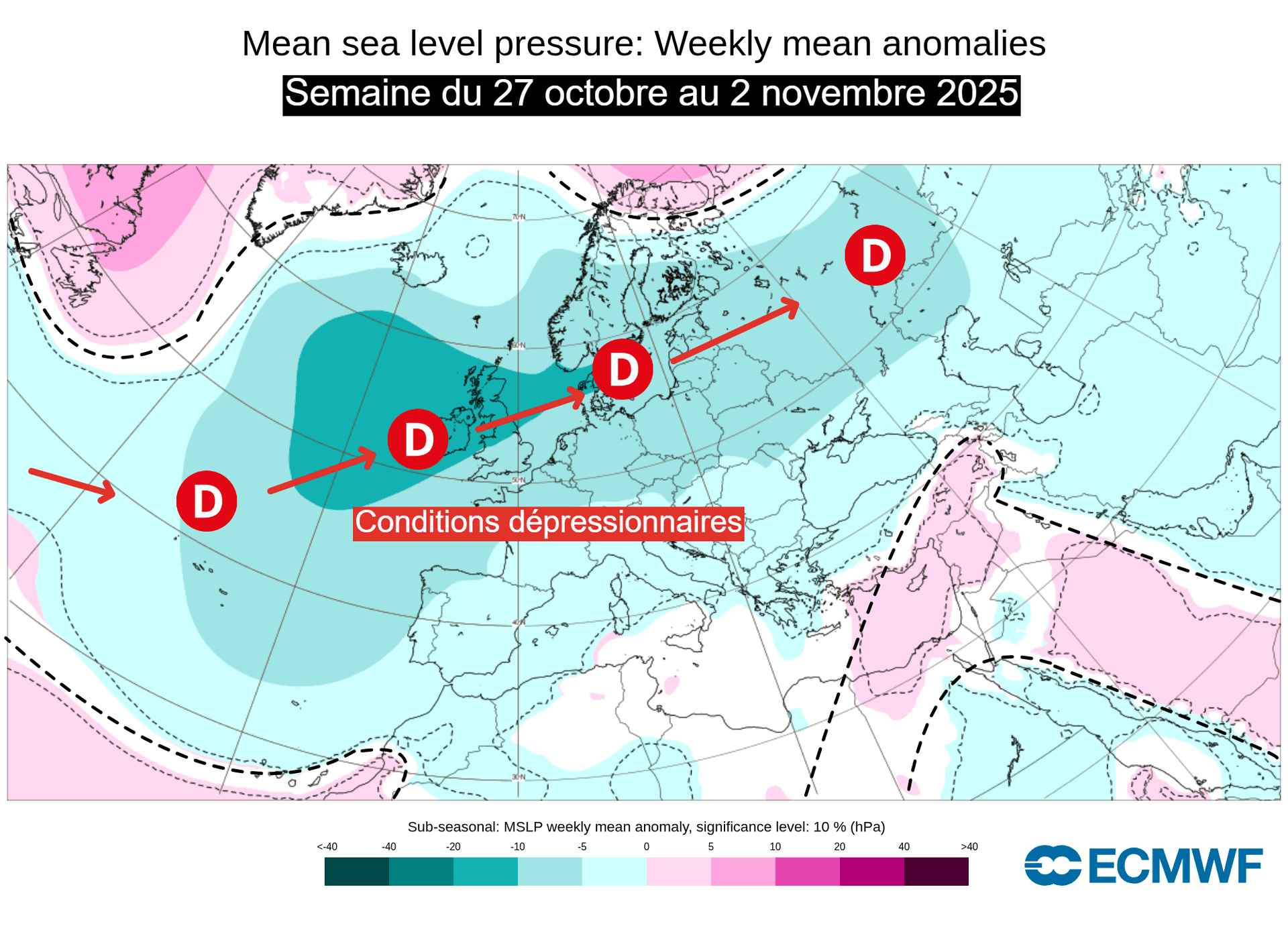 Anomalies de pression sur l'Europe pour la semaine du 27 octobre au 2 novembre 2025 - ECMWF