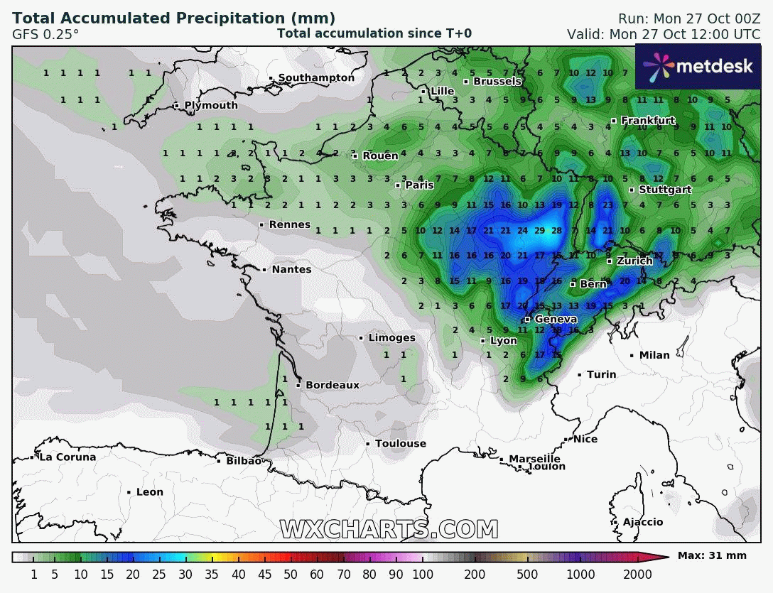 Animation des cumuls de précipitations jusqu'au 2 novembre 2025 sur la France – Modèle GFS via WX CHARTS