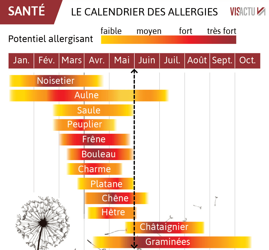 Ceux qui sont allergiques aux pollens l'auront sans doute déjà remarqué : c'est la pleine saison des graminées ! Alors que les pollens de bouleau ne représentent plus aucune menace, les graminées entrent dans le coeur de leur saison. Cette année, la végétation est à un stade d'avancement proche de la norme. Ainsi, le calendrier ci-dessous est particulièrement fidèle à la réalité. En arrivant au mois de juin, les pollens de graminées entrent dans leur période de concentrations les plus importantes. Celle-ci se prolonge généralement jusqu'en juillet en déclinant peu à peu.