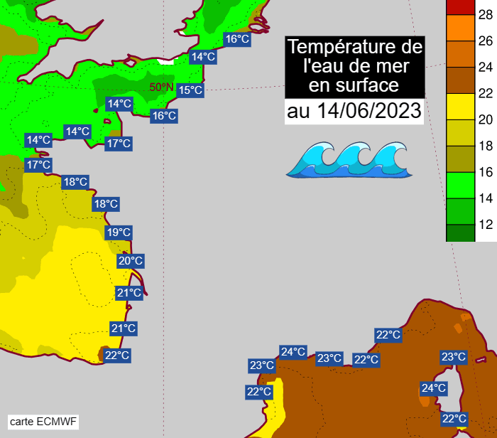 Températures de l'eau de mer sur les côtes françaises en date du mercredi 14 juin 2023 - via ECMWF
