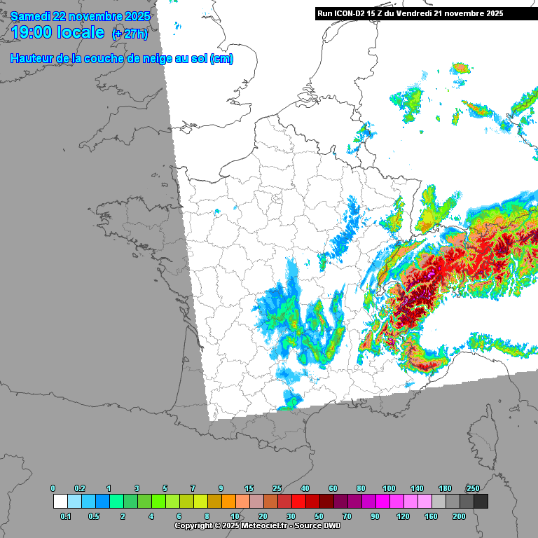 Évolution de l'épaisseur de neige au sol prévue par le modèle météo allemand icône entre samedi 19h et dimanche 16h - METEOCIEL