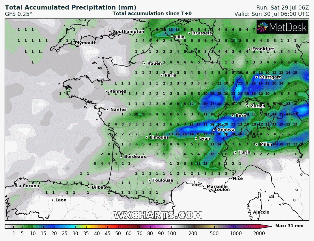 Accumulation des précipitations prévues - du 30 juillet au 06 août 2023 - Modèle GFS via WxCharts