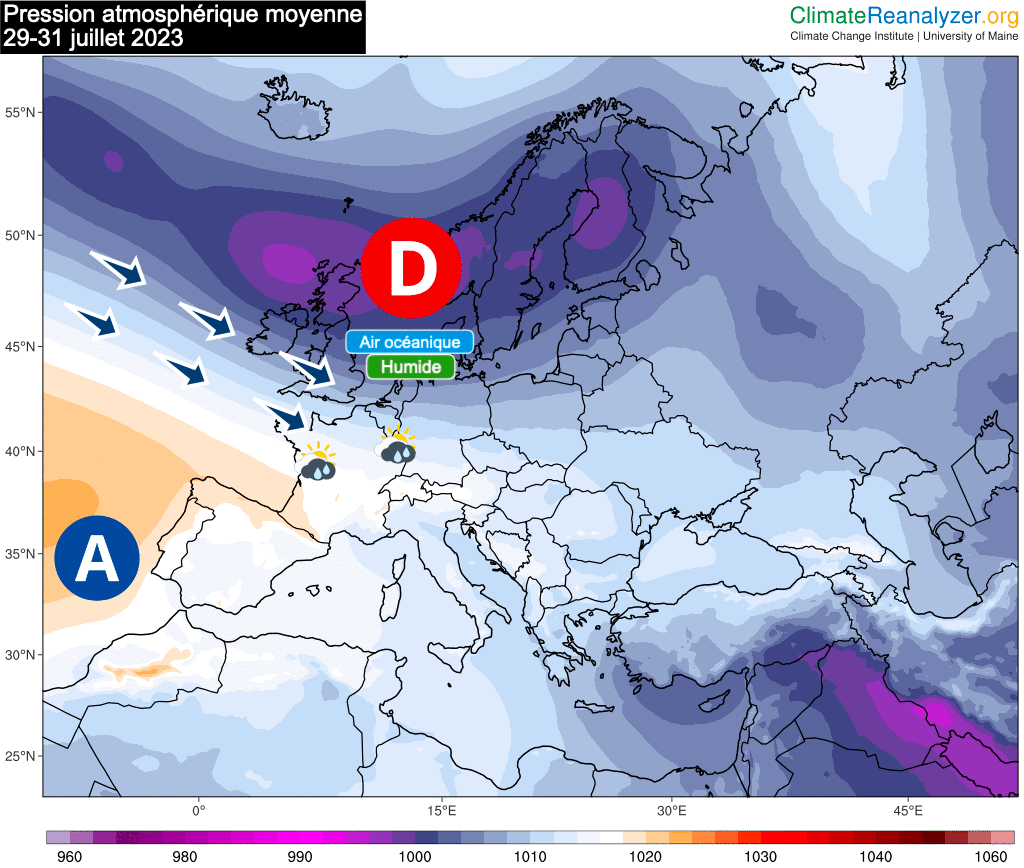 Situation générale et pression atmosphérique moyenne prévue - du 29 au 31 juillet puis du 01 au 03 août 2023 - ClimateReanalyzer