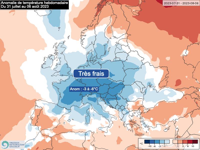 Les températures basculeront sous les moyennes de saison sur la totalité du pays au fil de la semaine à venir. Sur le massif-Central, le Centre-Est et le Nord-Est, l'anomalie moyennée sur la semaine prochaine (du 31 juillet au 06 août) pourrait même atteindre les -5 à -6°C. Certains après-midi, l'anomalie pourrait même approcher les -7 à 8°C sur certaines régions sous les précipitations. Un air particulièrement frais qui concernera d'ailleurs la quasi-totalité du continent Européen.