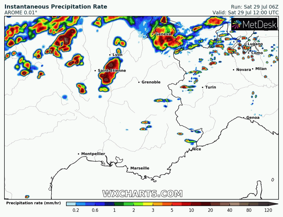 Animation des orages prévus - après-midi et soirée du samedi 29 juillet 2023 - Modèle Arome via WxCharts