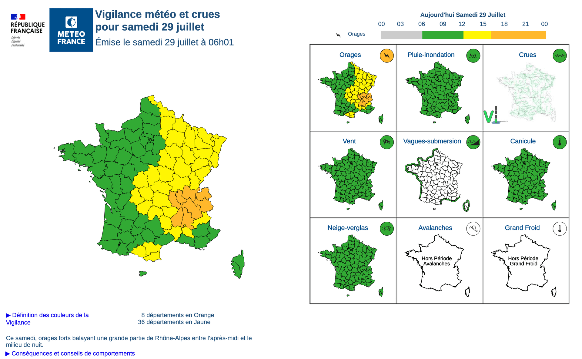 D'autres orages encore plus vigoureux sont attendus pour la fin de journée de ce samedi 29 juillet 2023 sur la vallée du Rhône et les Alpes. En fin d'après-midi et soirée, une ligne orageuse active devrait en effet balayer plusieurs départements, accompagnée de fortes pluies, localement de grêle ainsi que de grosses bourrasques de vent. La situation devrait se décanter principalement à partir de 17h, avant une évacuation de ces orages par les Alpes en fin de soirée (22-23h environ).