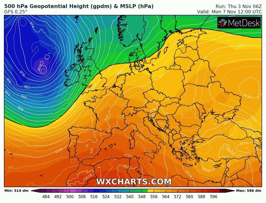 Animation des géopotentiels à 500 hPa sur l'Europe du 7 au 11 novembre 2022 – Modèle GFS via WX CHARTS