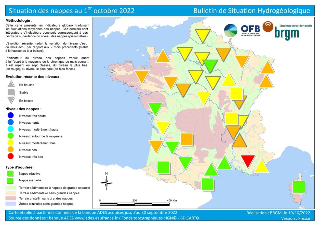 État des nappes phréatiques en France au 1er octobre 2022 – BRGM