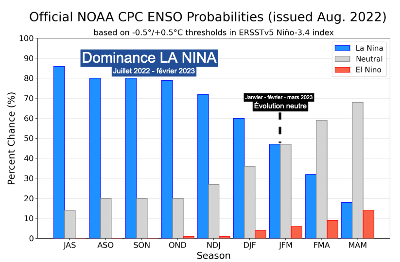 Alors que la température de l'océan Pacifique Équatorial reste bien fraîche, la prévision probabiliste pour ces prochains mois laisse entrevoir une poursuite de cette séquence « La Niña » au cours de la fin d'année 2022, et même jusqu'au début de l'année 2023. Pour la prochaine saison à venir (septembre - octobre - novembre), les chances d'une poursuite du phénomène sont estimées à environ 80%. Ceci diminue pour début 2023 (60% pour la période décembre-janvier-février) avant la fin possible de l'évènement au printemps 2023 (prévision "neutre" majoritaire).