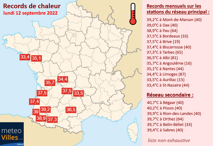 Sur les stations de Météo France, ce sont plus de 120 records mensuels de chaleur qui ont été battus ce 12 septembre 2022, dont de nombreux sur le réseau principal où il a fait jusqu'à 39,2°C à Mont-de-Marsan et 39,0°C à Dax ! Avec 38,9°C, Pau a pulvérisé son record de 36,3°C en septembre 1970 ! À Bordeaux, les 37,5°C de ce lundi ont battu les 37,0°C du 17 septembre 1987 ! Tarbes a pulvérisé un record vieux de septembre 1964 (37,3°C contre 35,8°C) ! Le record le plus ancien à avoir été battu est celui de Nantes avec 35,1°C ce lundi contre 34,3°C le 1er septembre 1961 !