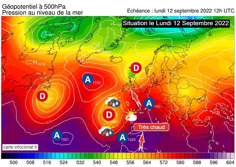 Situation à échelle continentale ce lundi 12 septembre 2022 - via infoclimat.fr