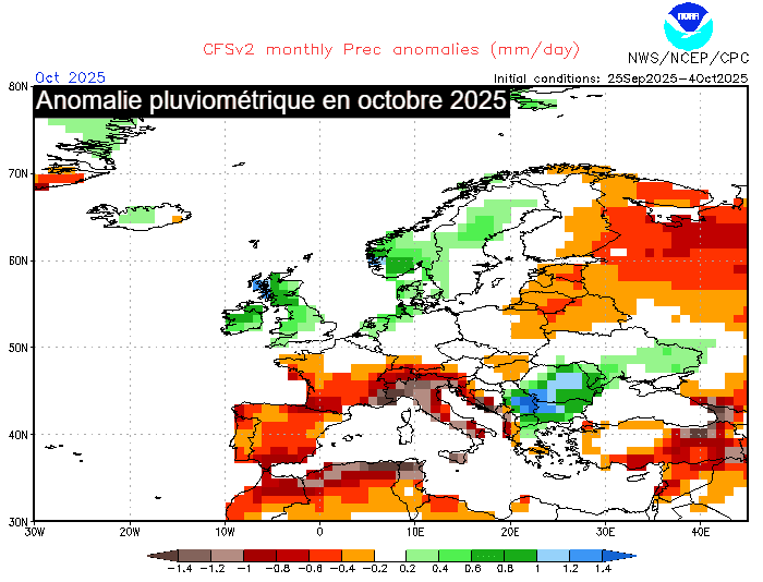 Anomalie pluviométrique envisagée en octobre 2025 - NOAA