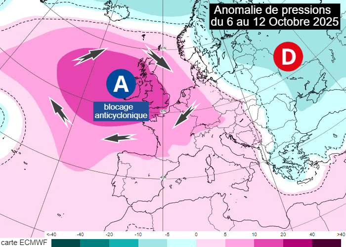 L'anticyclone regonfle actuellement au dessus de la France et ce dernier va s'ancrer durablement sur les Îles Britanniques dans le courant des prochains jours. On assiste à la mise en place d'un blocage anticyclonique qui influencera largement notre pays durant cette semaine du lundi 6 au dimanche 12 octobre 2025. L'anomalie de pression sur une semaine sera proche de +10 hPa en Manche, témoignant d'un anticyclone puissant. Nos régions verront la mise en place progressive d'un flux de nord-est dominant, advectant un air sec souvent propice à des journées lumineuses.