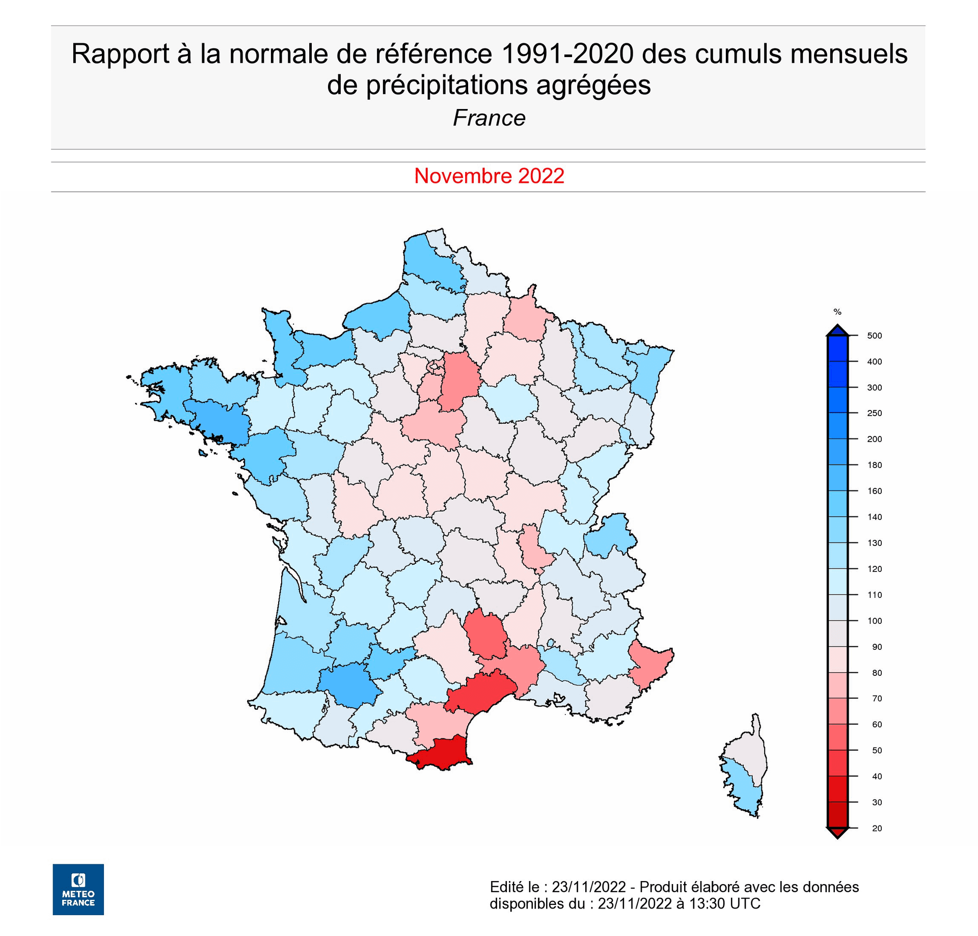 Cette carte permet de montrer que tous les départements sont loin d'avoir reçu des précipitations conséquentes. Les régions allant du Languedoc-Roussillon à l'Île-de-France et aux Ardennes sont souvent déficitaires en terme de pluviométrie. Le déficit est au plus haut en Seine-et-Marne, en Lozère, dans l'Hérault et les Pyrénées-Orientales mais également dans les Alpes-Maritimes. À l'inverse, les départements bordant la Manche, le sud-ouest et la Corse-du-Sud ont été plus copieusement arrosés, plus que lors d'un mois de novembre normal.