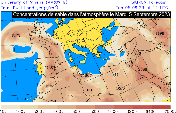 Concentrations en sable dans l'atmosphère le mardi 5 septembre 2023 - carte SKIRON