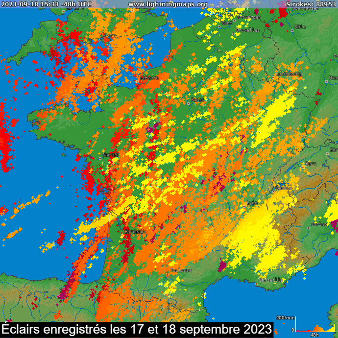 Carte des éclairs enregistrés les dimanche 17 et lundi 18 septembre 2023 - via lightningmaps.org