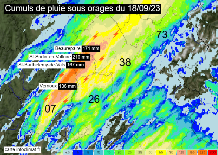 Ce lundi 18 septembre 2023, la dégradation orageuse s'est poursuivie en migrant vers le quart sud-est de la France. C'est entre le nord des départements de l'Ardèche et de la Drôme ainsi que dans l'ouest de l'Isère que les orages ont été les plus forts, prenant un caractère stationnaire et déversant d'impressionnantes quantités d'eau de la fin de nuit jusqu'en après-midi. Il est tombé jusqu'à 210 mm à Saint-Sorlin-en-Valloire dans le nord de la Drôme et 171 mm à Beaurepaire dans l'ouest de l'Isère ! Les cumuls horaires ont atteint les 60 mm au plus fort des orages, causant des inondations.