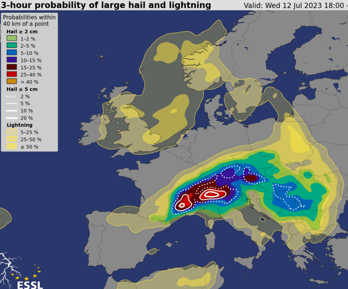 Probabilité de grêle sous orage le mercredi 12 juillet 2023 en fin de journée - carte ESSL
