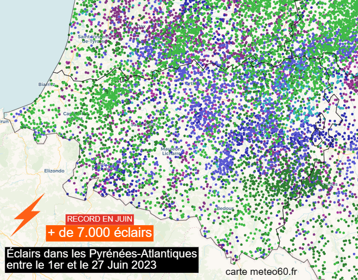 Carte des éclairs dans les Pyrénées-Atlantiques entre le 1er et le 27 juin 2023 - via meteo60.fr