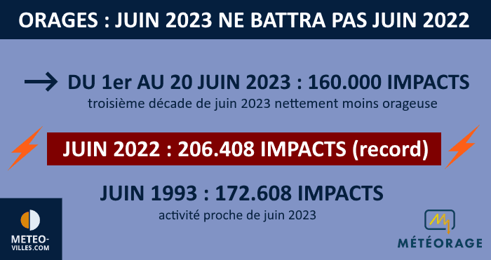 Durant les deux premières décades du mois de juin 2023, le réseau Météorage a comptabilisé environ 160.000 impacts de foudre (uniquement les éclairs nuage-sol) en France. C'est un chiffre important mais qui reste en dessous du record établi par le mois de juin 2022. L'an dernier, Météorage avait enregistré 206.408 impacts de foudre au sol en juin ! Avec une troisième décade nettement moins orageuse que les deux premières, il est d'ores et déjà acquis que juin 2023 restera plusieurs longueurs derrière juin 2022 en terme d'activité foudre. Il sera plus proche de juin 1993 et ses 172.608 impacts de foudre.