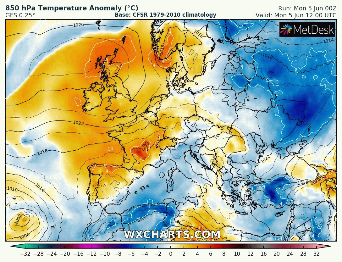 Anomalies de températures à 850 hPa du 5 au 12 juin 2023 – Modèle GFS via WX CHARTS