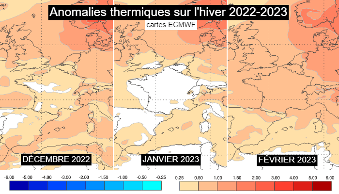 Anomalies thermiques mensuelles pour l'hiver 2022-2023 - modèle européen via ECMWF