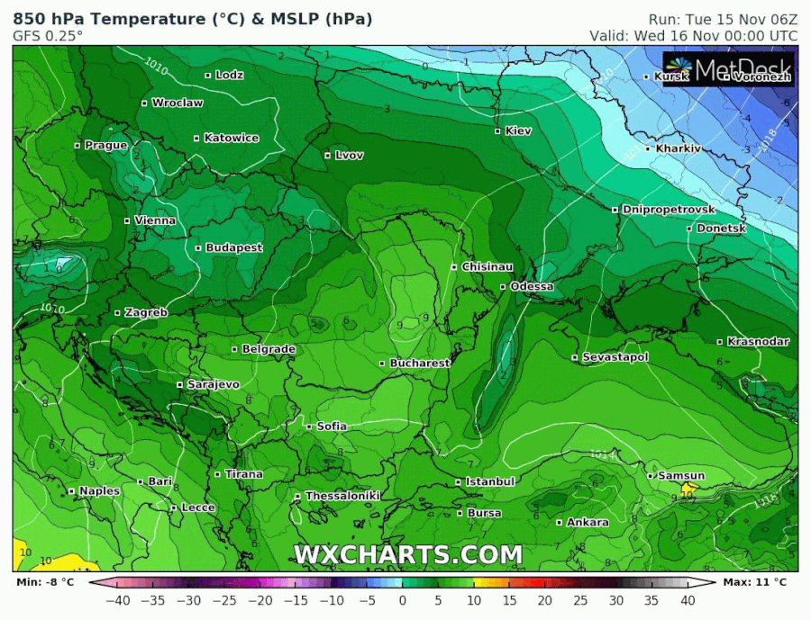 Masse d'air à 850 hPa (vers 1500m) sur l'Europe de l'Est du mercredi 16 au samedi 19 novembre 2022 – via wxcharts.com