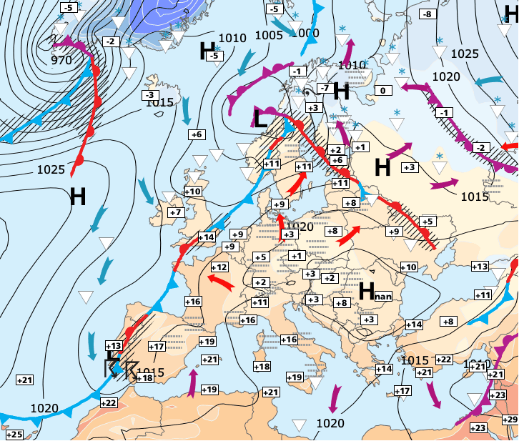 + Le blocage anticyclonique se poursuit et la dépression qui s’est formée sur l’Ouest de la France va régresser vers le sud dans les prochaines heures.