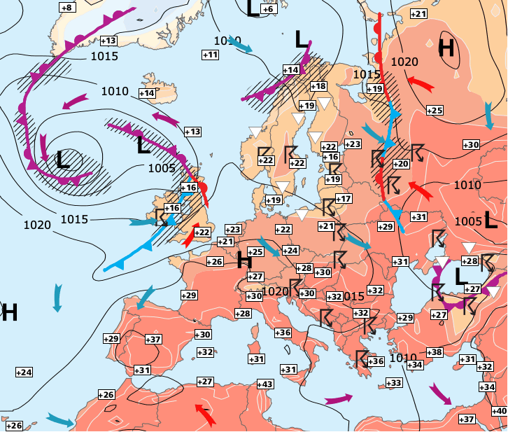 + Cette véritable fournaise (responsable des incendies en Grèce, Italie, Algérie) va tenter de s'étendre vers le nord de la France d’ici la fin de la semaine, sans réellement y parvenir…