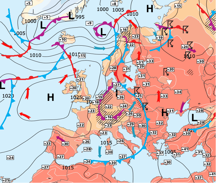 Noms des dépressions et anticyclones prévus pour vendredi 16 juillet 2021 à midi (Berlin)