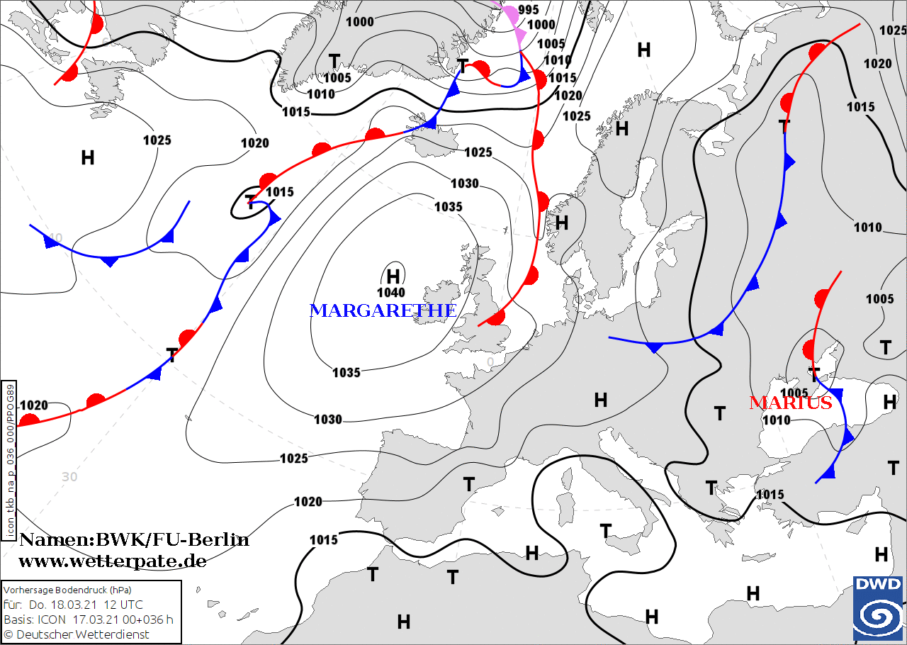 Noms des dépressions et anticyclones prévus pour jeudi 18 mars 2021 à midi (Berlin)