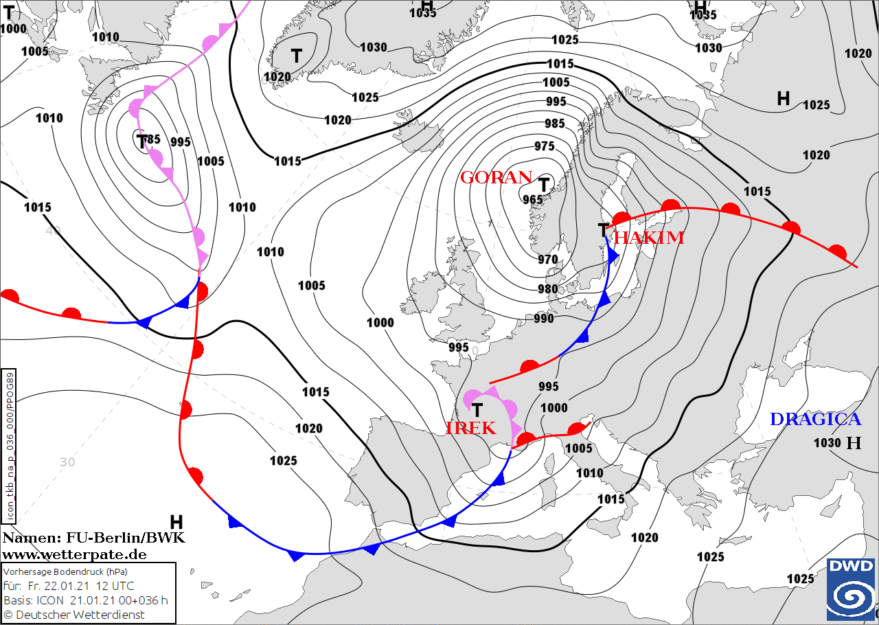 Noms des dépressions et anticyclones prévus pour vendredi 22 janvier 2021 à midi (Berlin)