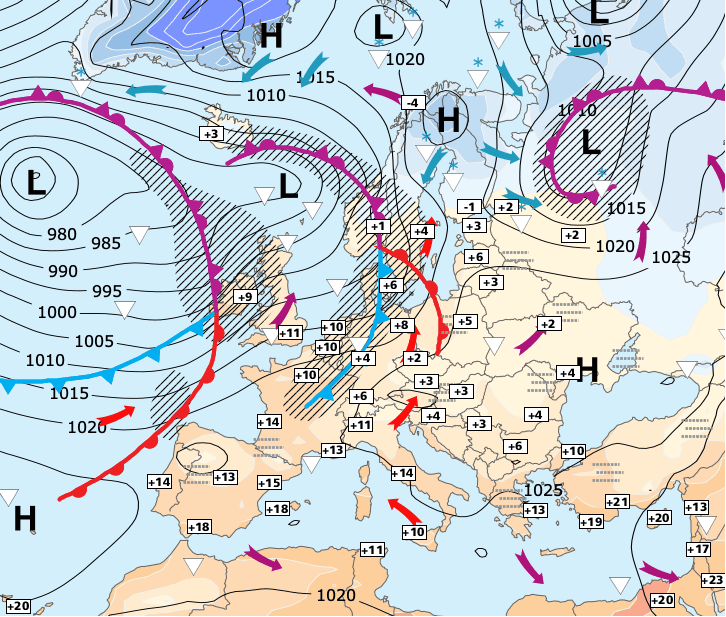 + La France reste en partie protégée par l’anticyclone d'Europe continentale qui teint à l'écart le courant perturbé océanique.