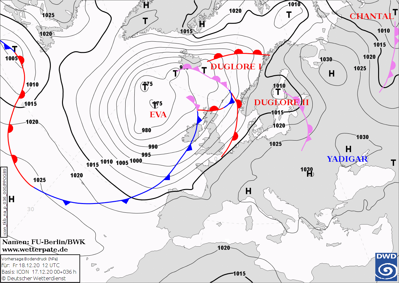 Noms des dépressions et anticyclones prévus pour vendredi 18 décembre 2020 à midi (Berlin)